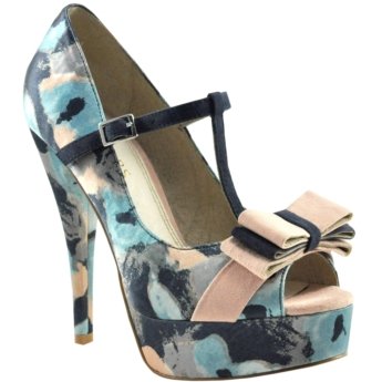 Swing into spring with this satin platform pump featuring a charming floral print design, adjustable suede t-strap and peep-toe detailing with adorable bow décor.