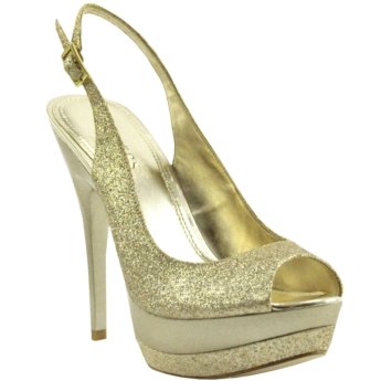 Shine all night long with this dazzling glitter pump featuring a sling-back design with adjustable buckle closure, adorable peep-toe design and curvaceous metallic heel with corresponding double platform.